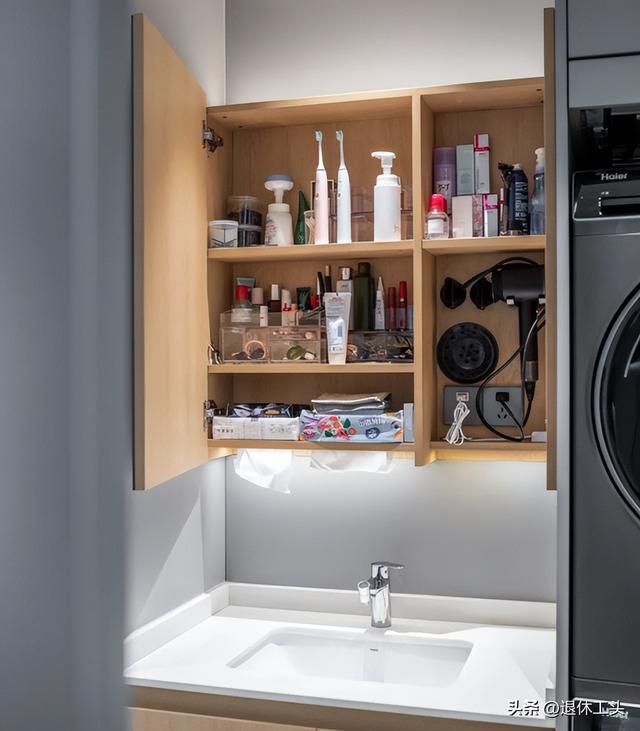 镜柜如果不密封的话,里面可以放吹风机、电动牙刷、剃须刀之类的。